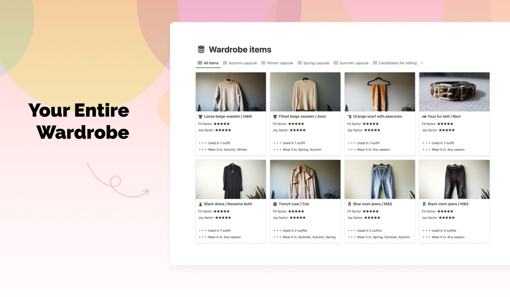 This comprehensive Notion dashboard will help anybody with a wardrobe feel confident in how they look, save money on clothes and have a better-organised closet.